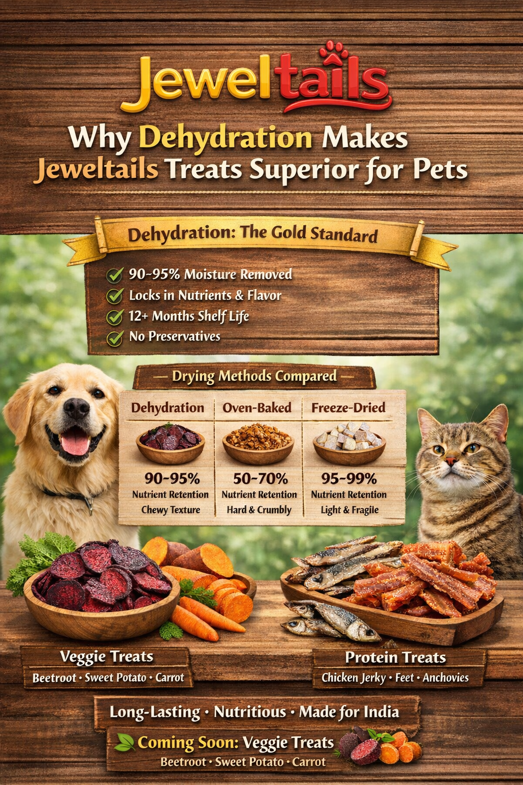 From chicken jerky to fresh beetroot slices, the drying method defines your pet’s treat quality. Pet parents ask: does it matter if treats are dehydrated, baked, or freeze-dried? Yes—it impacts nutrition, texture, safety, and value. At Jeweltails, we use low-heat dehydration across veg and non-veg for maximum goodness. Dehydration: The Gold…